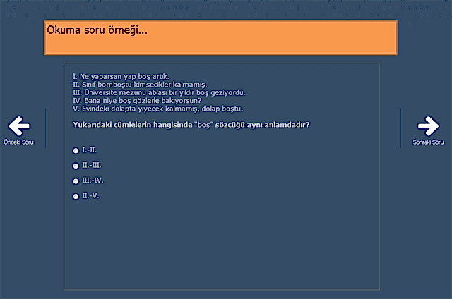 Okuduğunu anlama becerisinin ölçüldüğü çoktan seçmeli sorulardan oluşan bölümdür.