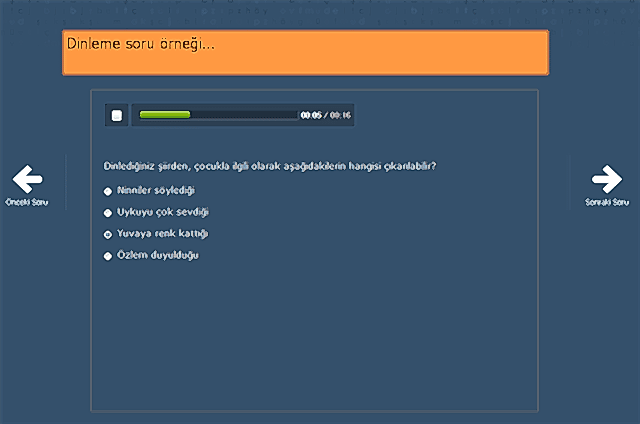 Dinlediğini anlama becerisinin ölçüldüğü çoktan seçmeli sorulardan oluşan bölümdür.