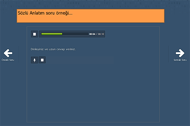 - Sözlü Anlatım: Kullanıcılara yazılı ve görsel kaynaklar kullanılarak yöneltilen ve kullanıcılardan sözlü olarak cevaplaması İstenen soruların yer aldığı bölümdür. Bu bölümde uzun cevaplar verilmeli. (En az 3-5 dakika)